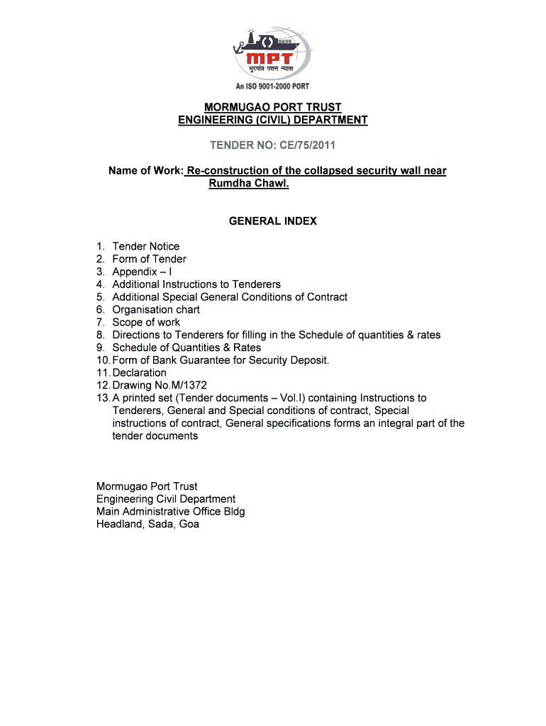 FORMULA PORT TRUST ENGINEERING (CIVIL) DEPARTMENT TENDER NO: CE/75/2011 Name of Work: Reconstruction of the collapsed security wall near Buddha Crawl. GENERAL INDEX 1. Tender Notice 2. Form of Tender