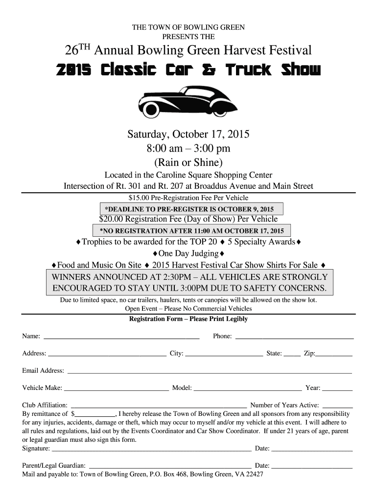THE TOWN OF BOWLING GREEN PRESENTS THE 26TH Annual Bowling Green Harvest Festival 2015 Classic Car & Truck Show Saturday, October 17, 2015 8:00 am 3:00 pm (Rain or Shine) Located in the Caroline Square