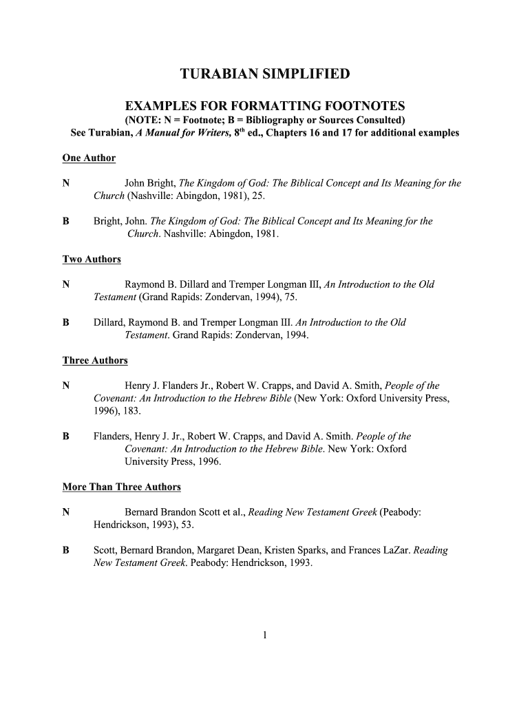 ARABIAN SIMPLIFIED EXAMPLES FOR FORMATTING FOOTNOTES (NOTE: N Footnote; B Bibliography or Sources Consulted) See Arabian, A Manual for Writers, 8th ed., Chapters 16 and 17 for additional examples