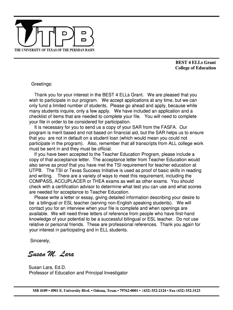 BEST 4 Ells Grant College of Education Greetings: Thank you for your interest in the BEST 4 Ells Grant. We are pleased that you wish to participate in our program. We accept applications at any time,