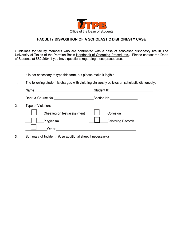 Get the free Faculty disposition of a scholastic dishonesty case - The University of - utpb
