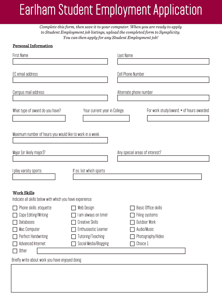 Earl ham Student Employment Application Complete this form, then save it to your computer. When you are ready to apply to Student Employment job listings, upload the completed form to Simplicity.