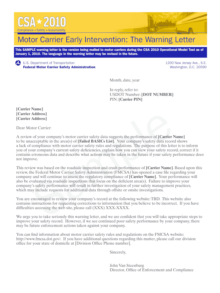 Compliance Safety AcountabilityMotor Carrier Early Intervention: The Warning Letter This SAMPLE warning letter is the version being mailed to motor carriers during the CSA 2010 Operational Model Test