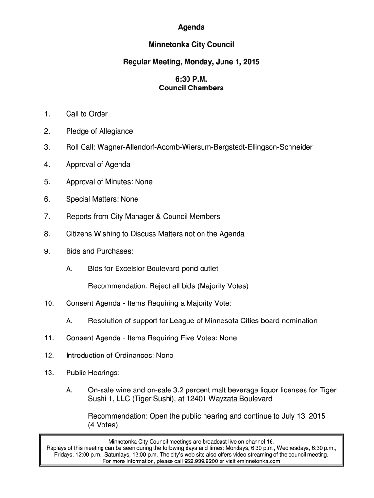 Get the free Agenda Minnetonka City Council Regular Meeting, Monday, June 1 ...