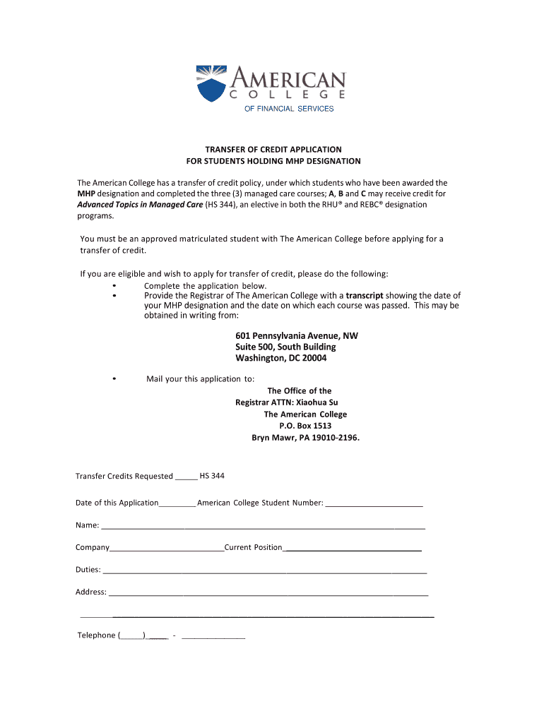 OF FINANCIAL SERVICES TRANSFER OF CREDIT APPLICATION FOR STUDENTS HOLDING MHP DESIGNATION The American College has a transfer of credit policy, under which students who have been awarded the MHP designation