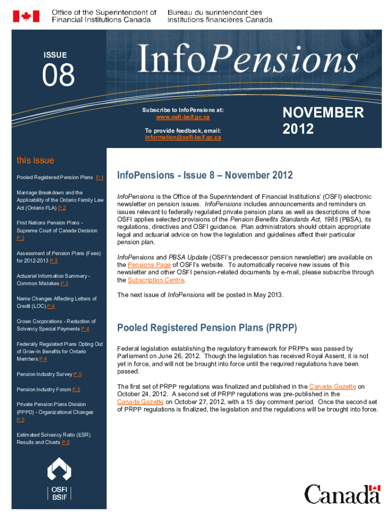 ISSUE08 Subscribe to InfoPensions at: www.osfibsif.gc.ca To provide feedback, email: information@osfibsif.gc.caNOVEMBER 2012this issue Pooled Registered Pension Plans P.1 Marriage Breakdown and the