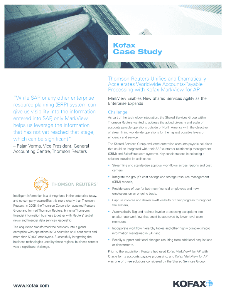 KofaxCase Study Thomson Reuters Unifies and Dramatically Accelerates Worldwide AccountsPayable Processing with Koufax Married for AP While SAP or any other enterprise resource planning (ERP) system
