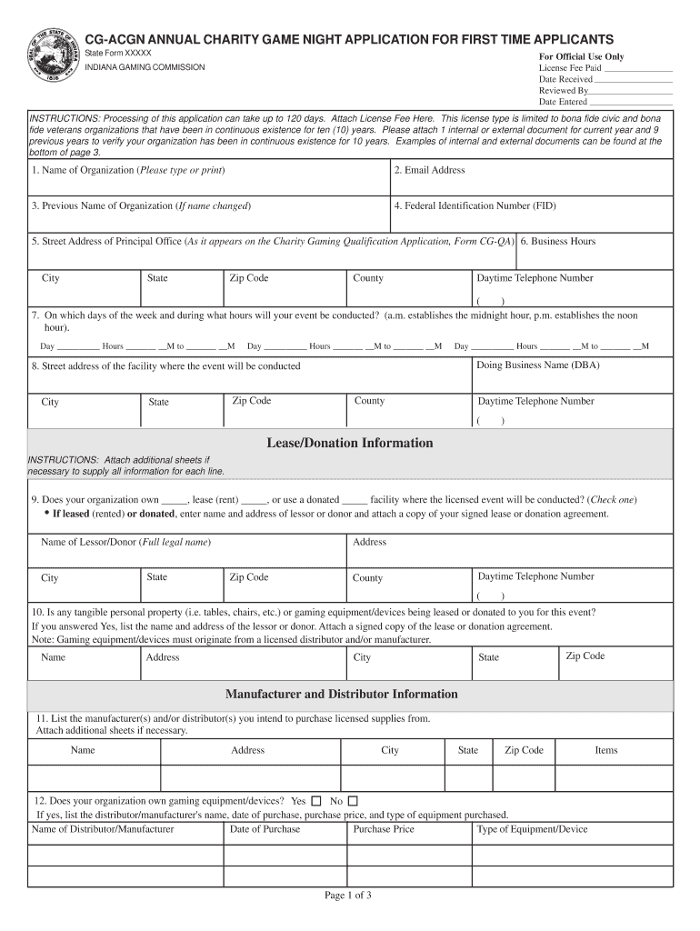 CG-ACGN ANNUAL CHARITY GAME NIGHT APPLICATION FOR FIRST TIME APPLICANTS State Form XXXIX INDIANA GAMING COMMISSION For Official Use Only License Fee Paid Date Received Reviewed By Date Entered INSTRUCTIONS: