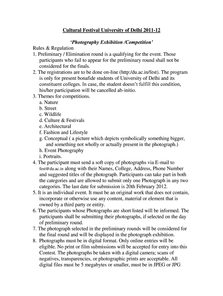 Cultural Festival University of Delhi 201112 Photography Exhibition /Competition Rules & Regulation 1. Preliminary / Elimination round is a qualifying for the event. Those participants who fail to