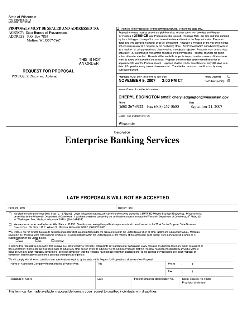 Get the free 75 DOA3261 N(R01/98) PROPOSALS MUST BE SEALED AND ADDRESSED TO: AGENCY: State Bureau...