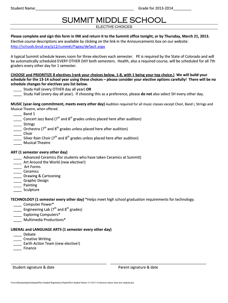 StudentName: Gradefor20132014 SUMMIT MIDDLE SCHOOL ELECTIVE CHOICES PleasecompleteandsignthisforminINKandreturnittotheSummitofficetonight, orbyThursday,March21,2013. ElectivecoursedescriptionsareavailablebyclickingonthelinkintheAnnouncementsboxonourwebsite: