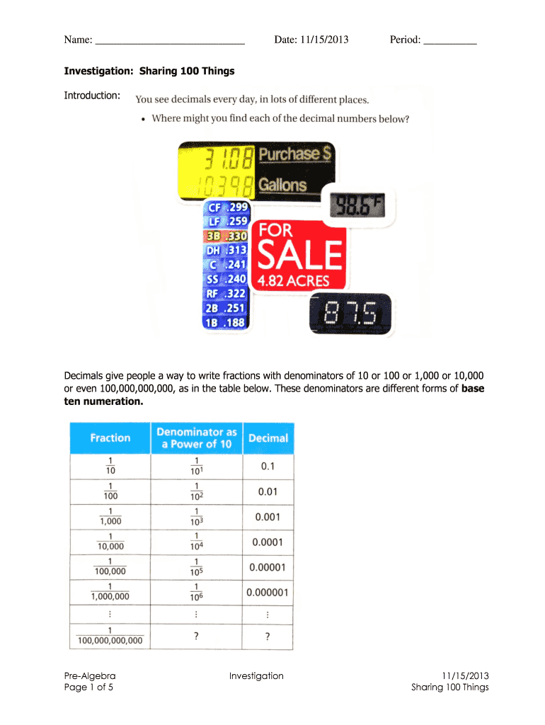 Name: Date: 11/15/2013 Period: Investigation: Sharing 100 Things Introduction: Decimals give people a way to write fractions with denominators of 10 or 100 or 1,000 or 10,000 or even 100,000,000,000,