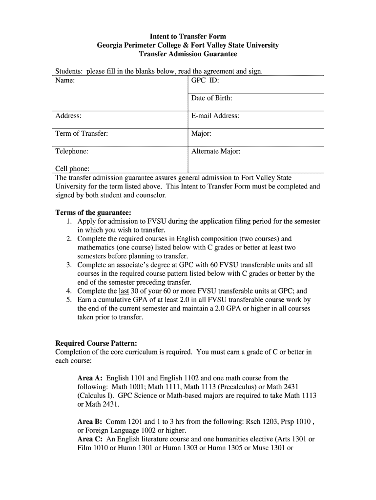 Intent to Transfer Form Georgia Perimeter College & Fort Valley State University Transfer Admission Guarantee Students: please fill in the blanks below, read the agreement and sign. Name: GPC ID: