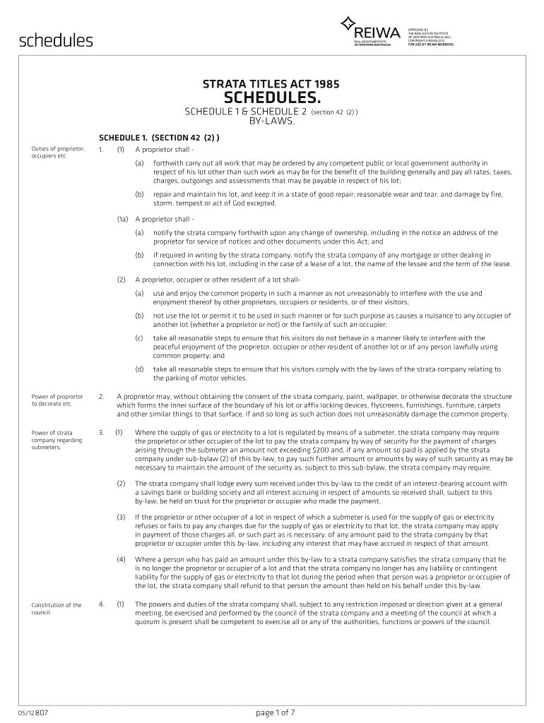 APPROVED BY THE REAL ESTATE INSTITUTE OF WESTERN AUSTRALIA (INC.) COPYRIGHT REI WA 2012 FOR USE B Y REI WA MEMO ERS schedules STRATA TITLES ACT 1985 SCHEDULES. SCHEDULE 1 & SCHEDULE 2 BY-LAWS. (section