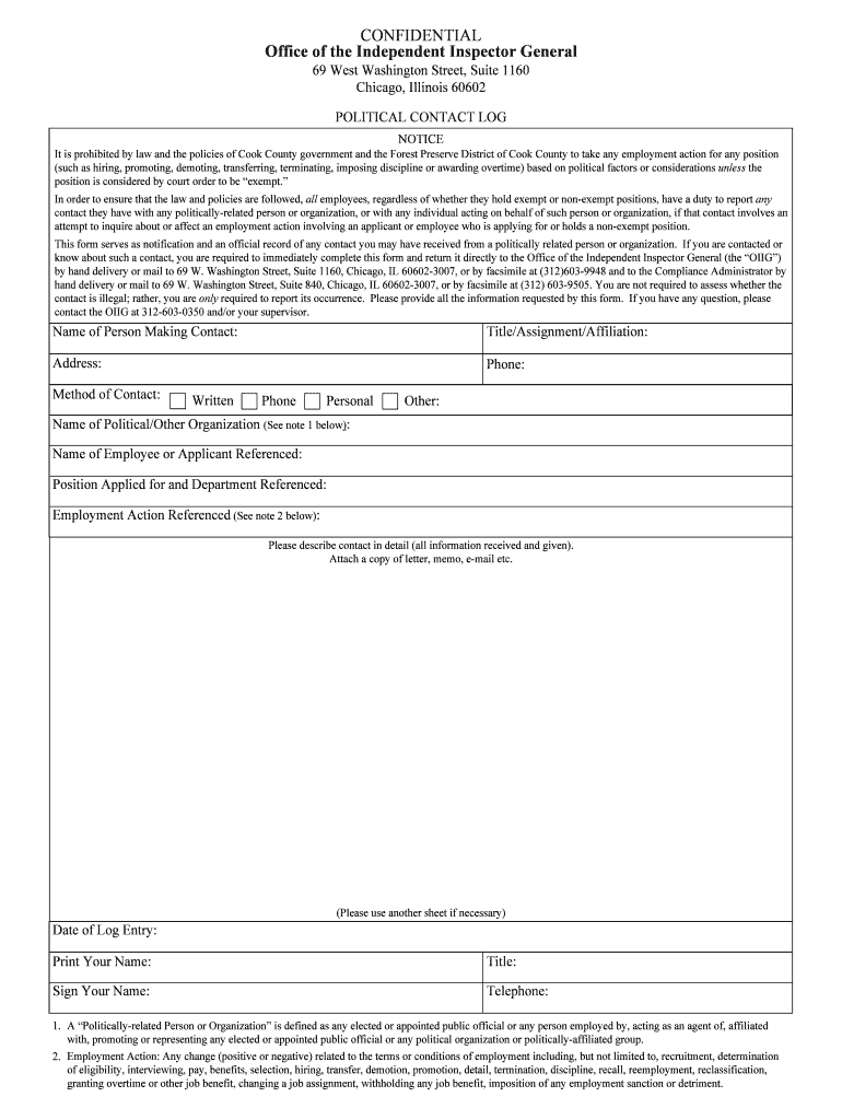CONFIDENTIAL Office of the Independent Inspector General 69 West Washington Street, Suite 1160 Chicago, Illinois 60602 POLITICAL CONTACT LOG NOTICE It is prohibited by law and the policies of Cook