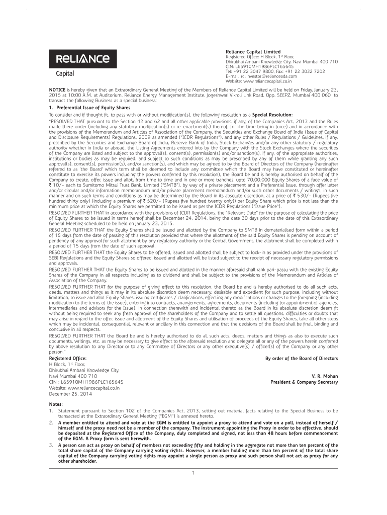 Get the free Notice of Extraordinary General Meeting - Reliance Capital