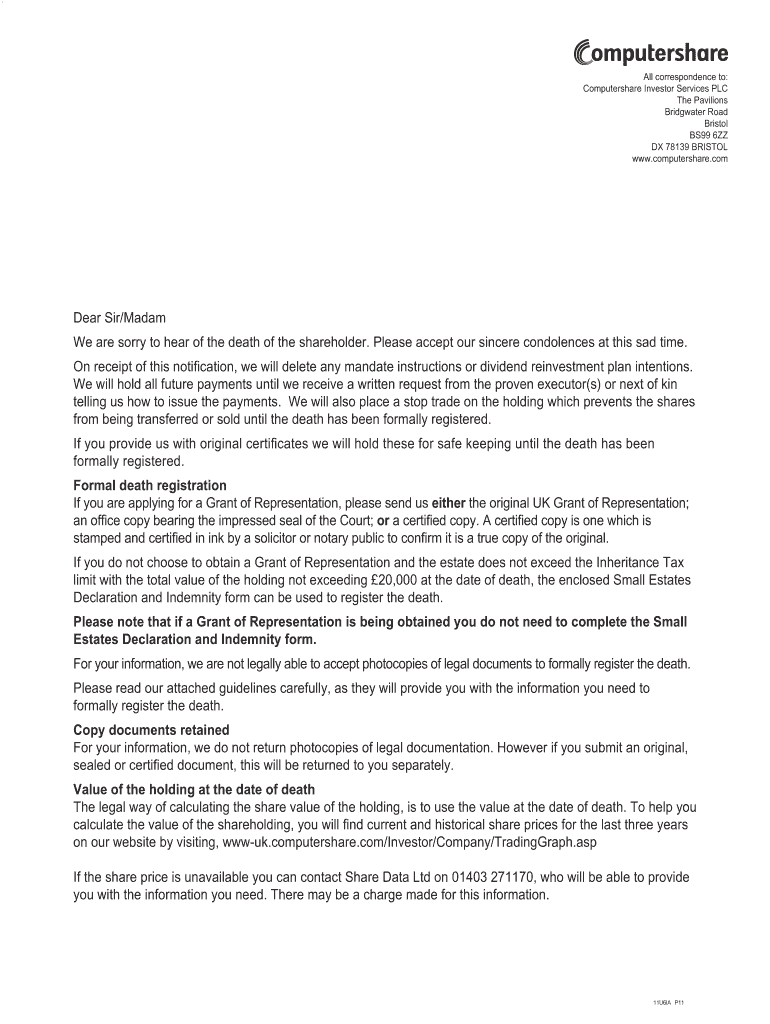 We are sorry to hear of the death of the shareholder. Please accept our .... The Small Estates Declaration and Indemnity form must be completed and signed by ...