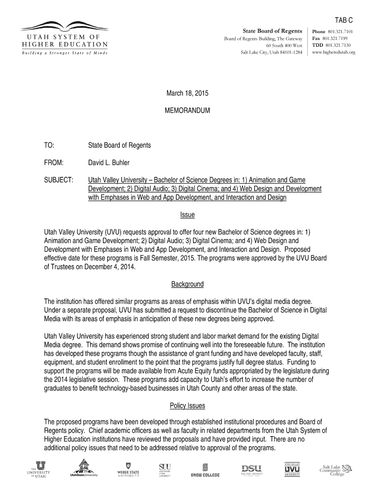 TAB C State Board of Regents Board of Regents Building, The Gateway 60 South 400 West Salt Lake City, Utah 841011284 Phone 801.321.7101 Fax 801.321.7199 TDD 801.321.7130 www.higheredutah.org March