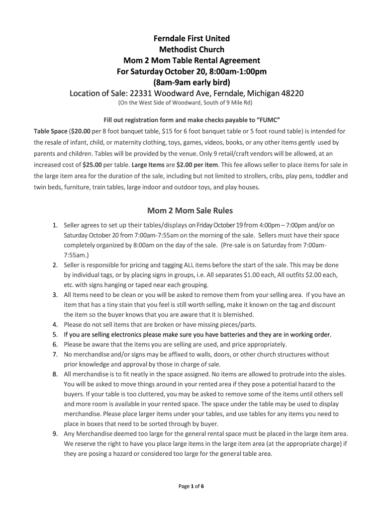 Fern dale First United Methodist Church Mom 2 Mom Table Rental Agreement For Saturday, October 20, 8:00am1:00pm (8am9am early bird) Location of Sale: 22331 Woodward Ave, Fern dale, Michigan 48220