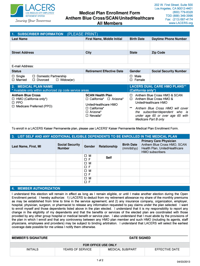 202 W. First Street, Suite 500 Los Angeles, CA 900124401 (800) 7798328 Medical Plan Enrollment Form TDD (888) 3493996 Anthem Blue Cross/SCAN/UnitedHealthcare Fax: (213) 6874174 www.LACERS.org All