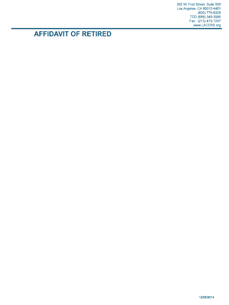 Print Reset Page 202 W. First Street, Suite 500 Los Angeles, CA 900124401 (800) 7798328 TDD (888) 3493996 Fax: (213) 4737297 www.LACERS.org AFFIDAVIT OF RETIRED FOR MEDICAL AND/OR DENTAL BENEFITS