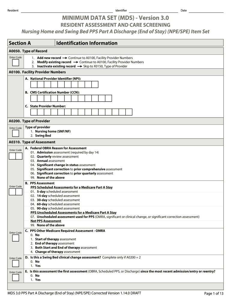 Resident Identifier Date MINIMUM DATA SET (MDS) Version 3.0 RESIDENT ASSESSMENT AND CARE SCREENING Nursing Home and Swing Bed PPS Part A Discharge (End of Stay) (NP/SPE) Item Set Section A. Identification