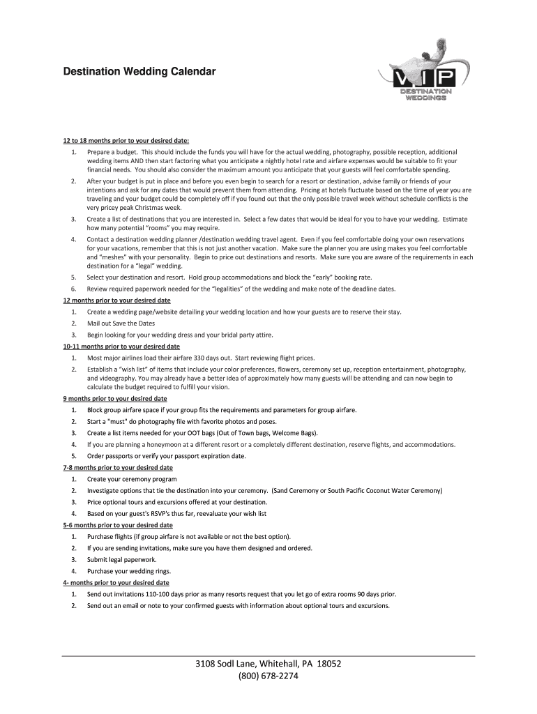 Destination Wedding Calendar 12to18monthspriortoyourdesireddate: 1. Prepareabudget. Thisshouldincludethefundsyouwillhavefortheactualwedding, photography, possible reception, additional weddingitemsANDthenstartfactoringwhatyouanticipateanightlyhotelrateandairfareexpenseswouldbesuitabletofityour