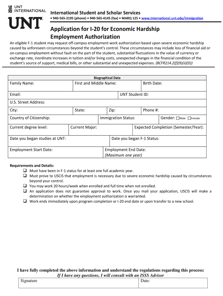 Get the free Application for I-20 for Economic Hardship Employment Authorization - international unt