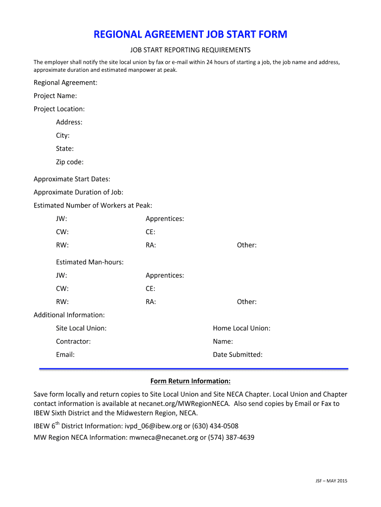 REGIONAL AGREEMENT JOB START FORM JOB START REPORTING REQUIREMENTS The employer shall notify the site local union by fax or email within 24 hours of starting a job, the job name and address, approximate