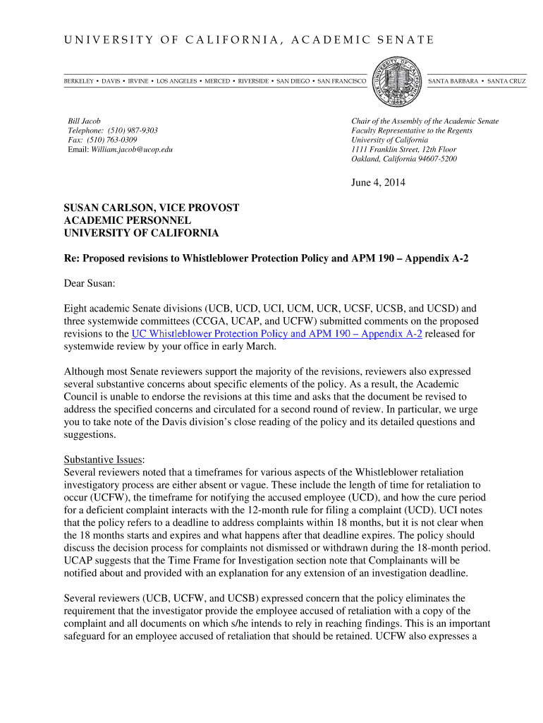 UNIVERSITY OF CALIFORNIA, ACADEMIC SENATE BERKELEY DAVIS IRVINE LOS ANGELES MERCED RIVERSIDE SAN DIEGO SAN FRANCISCO Bill Jacob Telephone: (510) 9879303 Fax: (510) 7630309 Email: William. Jacob cop.edu