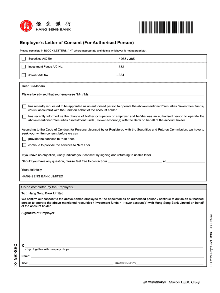 Get the free Employers Letter of Consent For Authorised - Hang Seng Bank