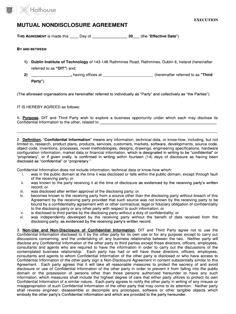 EXECUTION MUTUAL NONDISCLOSURE AGREEMENT THIS AGREEMENT is made this Day of 20 (the Effective Date) BY AND BETWEEN 1) Dublin Institute of Technology of 143146 Ratlines Road, Ratlines, Dublin 6, Ireland