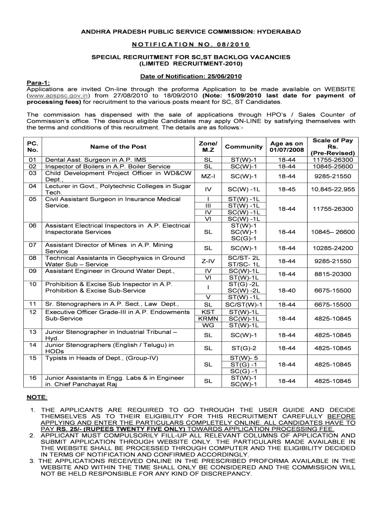 Get the free Notification No 082010 Special Recruitment For SCST Backlog - website apspsc gov