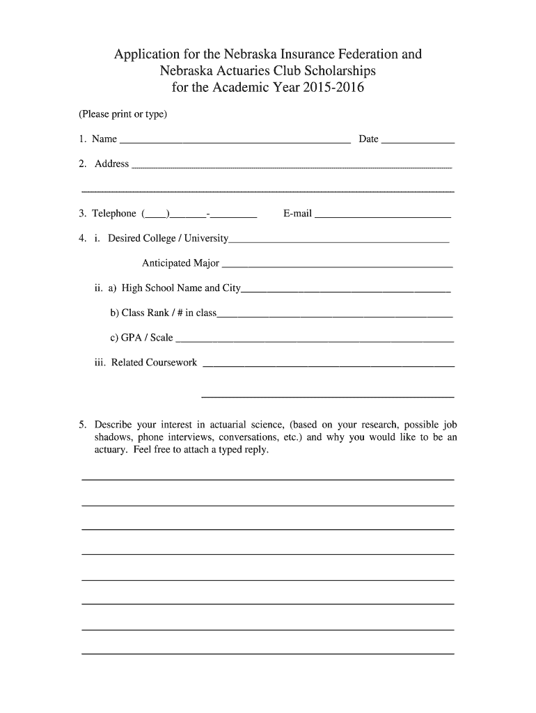 Application for the Nebraska Insurance Federation and Nebraska Actuaries Club Scholarships INSTRUCTIONS Two $4,000 scholarships will be awarded, with each scholarship payable in four equal installments