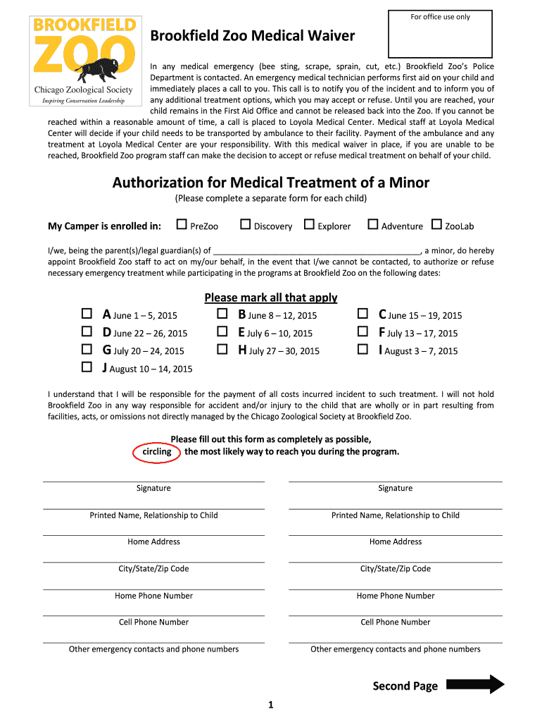 For office use only Brookfield Zoo Medical Waiver In any medical emergency (bee sting, scrape, sprain, cut, etc.) Brookfield Zoos Police Department is contacted. An emergency medical technician performs