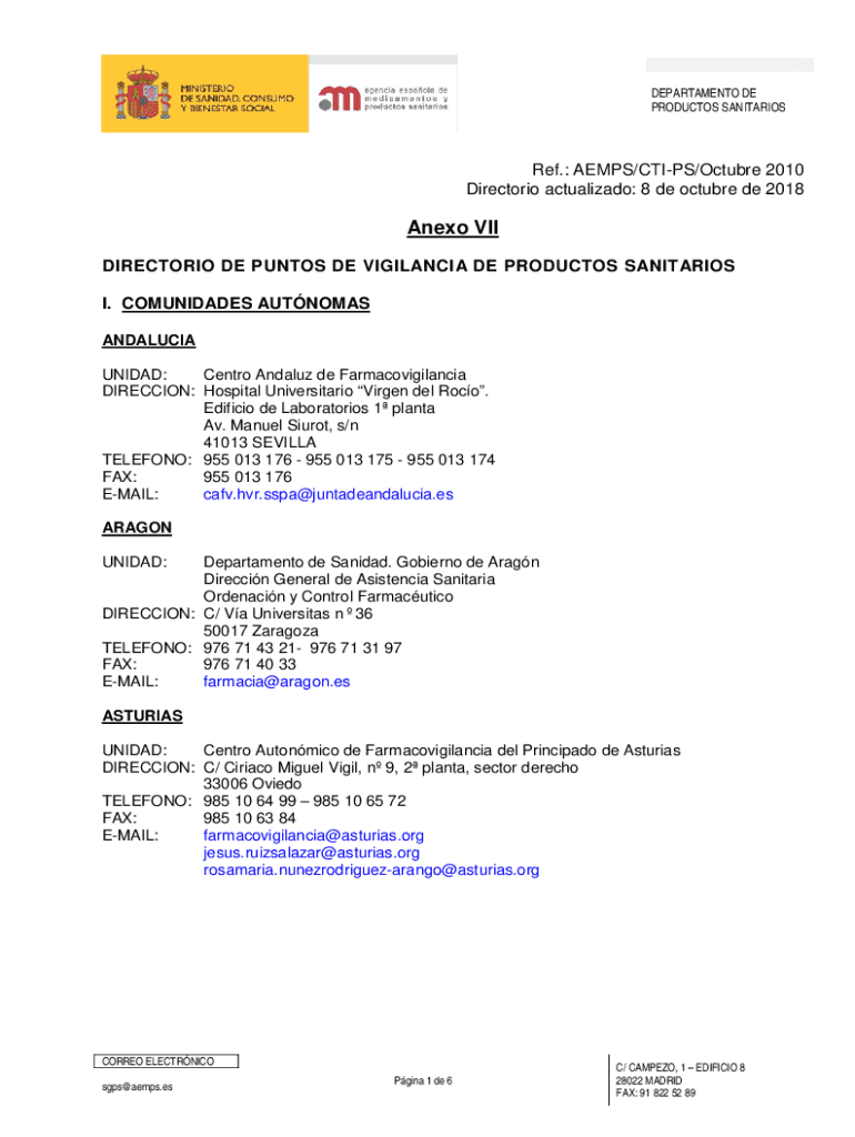 DEPARTAMENTO DE PRODUCTOS SANITARIOSRef.: AEMPS/CTIPS/Octubre 2010 Directorio actualizado: 8 de octubre de 2018Anexo VII DIRECTORIO DE PUNTOS DE VIGILANCIA DE PRODUCTOS SANITARIOS I. COMUNIDADES AUTNOMAS
