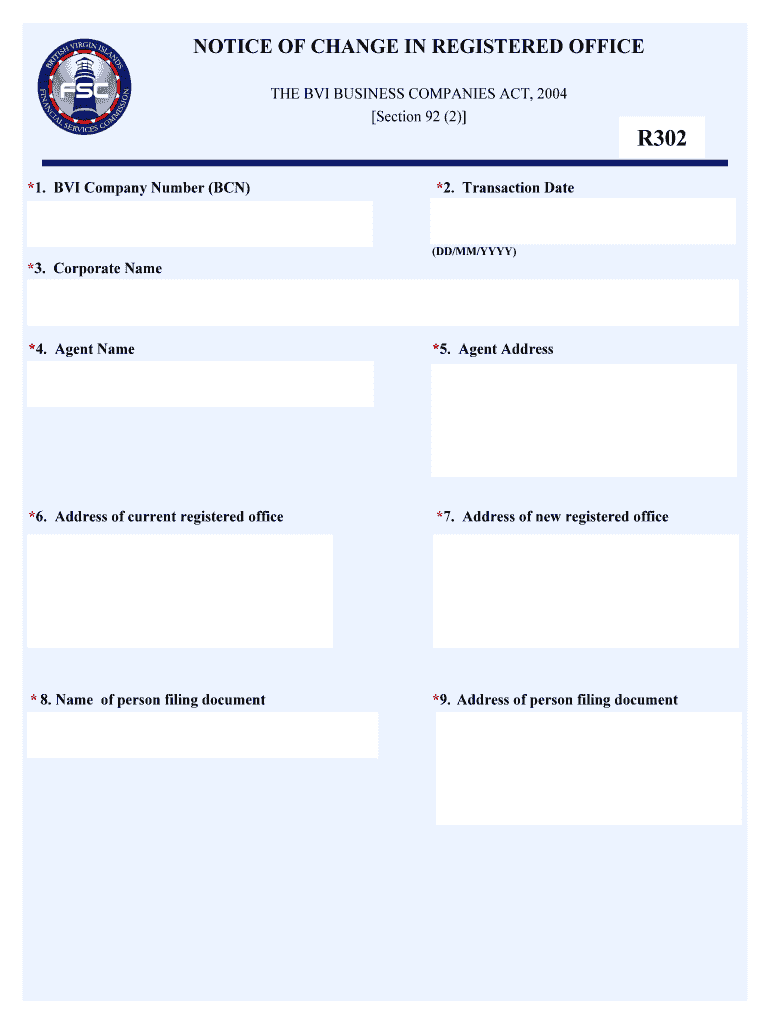 NOTICE OF CHANGE IN REGISTERED OFFICE THE BVI BUSINESS COMPANIES ACT, 2004 Section 92 (2) *1. BVI Company Number (BCN) *3. Corporate Name R302 *2. Transaction Date (DD/MM/YYY) *4. Agent Name *5. Agent
