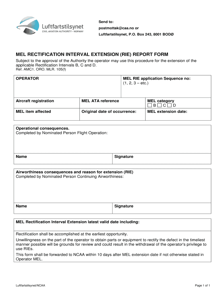 Send to: postmortem CAA.no or Luftfartstilsynet, P.O. Box 243, 8001 BOD MEL RECTIFICATION INTERVAL EXTENSION (RIE) REPORT FORM Subject to the approval of the Authority the operator may use this procedure