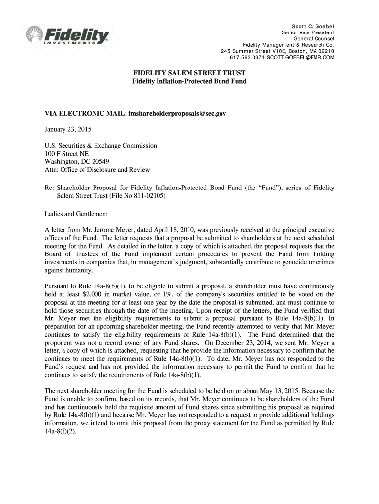 Scott C. Gospel Senior Vice President General Counsel Fidelity Management & Research Co. 245 Summer Street V10E, Boston, MA 02210 617.563.0371 SCOTT.GOSPEL FOR.FIDELITY SALEM STREET TRUST Fidelity