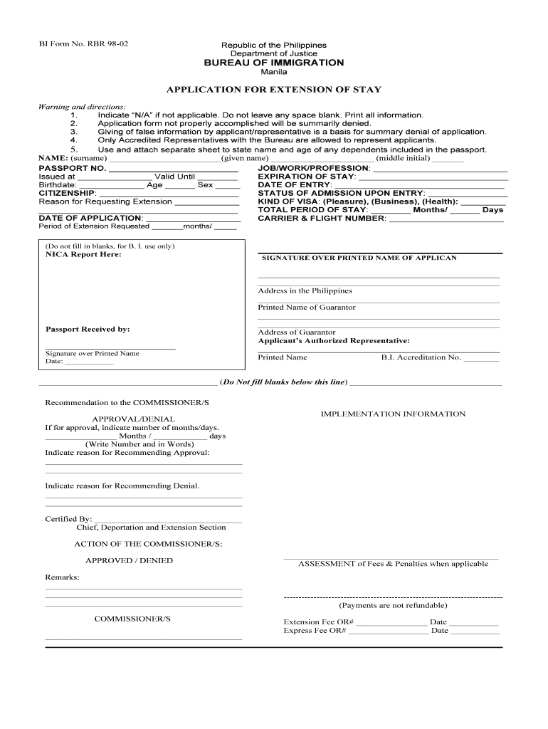 BI Form No. RBR 9802 Republic of the Philippines Department of Justice BUREAU OF IMMIGRATION Manila APPLICATION FOR EXTENSION OF STAY Warning and directions: 1. Indicate N/A if not applicable. Do