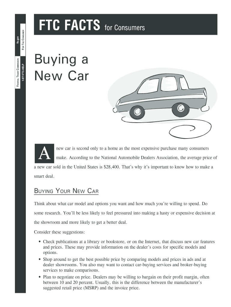 FTC.gov FOR THE CONSUMER 1877FTCHELP FEDERAL TRADE COMMISSION FTC FACTS for Consumers Buying a New Car A new car is second only to a home as the most expensive purchase many consumers make. According