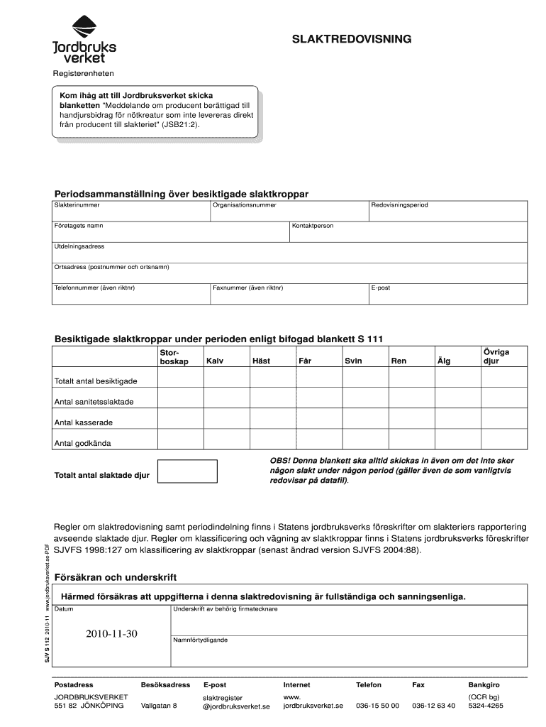 SLAKTREDOVISNING Registerenheten Km IMG ATT till Jordbruksverket kick blanket ten Meddelande on produced Bettina till handjursbidrag for treater some into lever eras direct fan produced till slakteriet