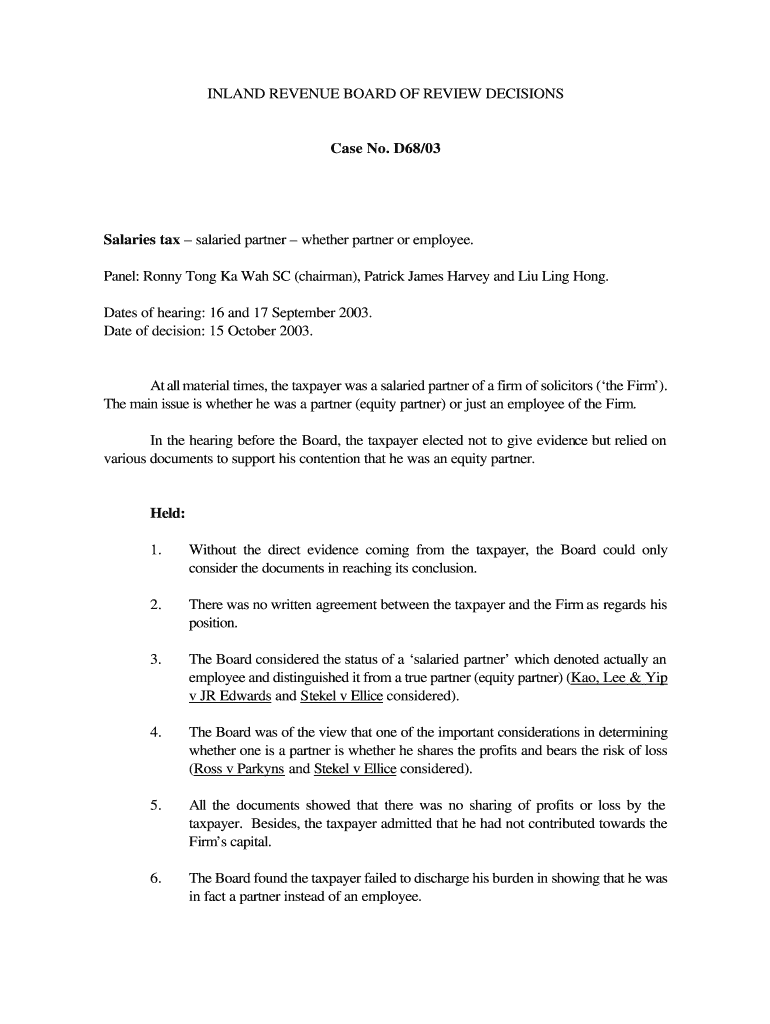 INLAND REVENUE BOARD OF REVIEW DECISIONS Case No. D68/03Salaries tax salaried partner whether partner or employee. Panel: Ronny Tong Key Was SC (chairman), Patrick James Harvey and Liu Ling Hong.