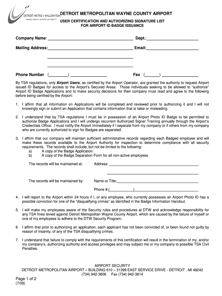 DETROIT METROPOLITAN WAYNE COUNTY AIRPORT USER CERTIFICATION AND AUTHORIZING SIGNATURE LIST FOR AIRPORT ID BADGE ISSUANCE Company Name: Dept.: Mailing Address: Email: Phone Number () Fax () By TSA