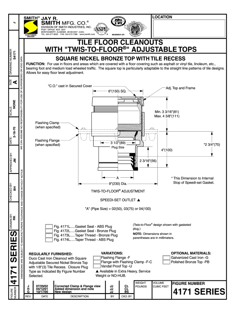 LOCATION N NTI GI N E RI N an on Rather T h C TILE FLOOR CLEANUPS WITH TWISTOFLOOR ADJUSTABLE TOPS WE CAN ASSUME NO RESPONSIBILITY FOR USE OF SUPERSEDED OR VOID DATA S4171 SQUARE NICKEL BRONZE TOP
