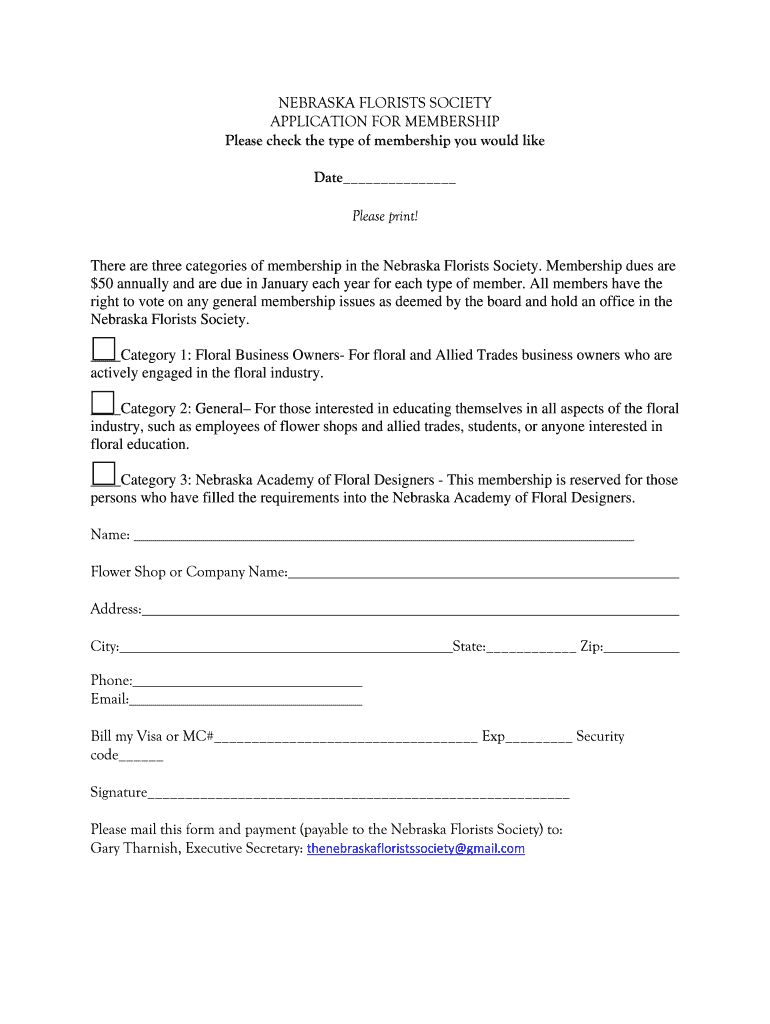 NEBRASKA FLORISTS SOCIETY APPLICATION FOR MEMBERSHIP Please check the type of membership you would like Date Please print! There are three categories of membership in the Nebraska Florists Society.
