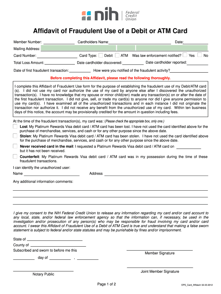 Get the free Affidavit of Fraudulent Use of a Debit or ATM Card - NIH Federal - nihfcu