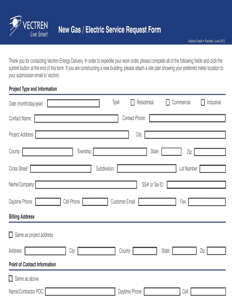 New Gas / Electric Service Request Form Indiana South Revised: June 2015 Thank you for contacting Lectern Energy Delivery. In order to expedite your work order, please complete all the following fields