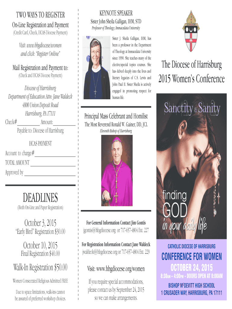 TWO WAYS TO REGISTER Online Registration and Payment (Credit Card, Check, HAS Diocese Payment) Visit: www.hbgdiocese/women and click: Register Online Mail Registration and Payment to: (Check and HAS