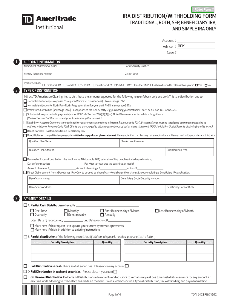 Get the free Reset Form IRA DISTRIBUTION/WITHHOLDING FORM TRADITIONAL, ROTH, SEP, BENEFICIARY IRA...